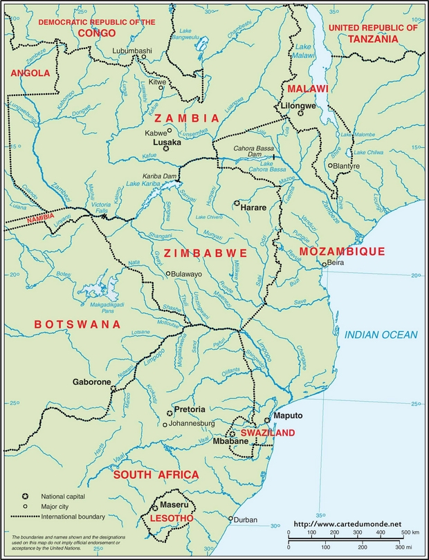 Mapa del sudeste de África, drenaje Inglés